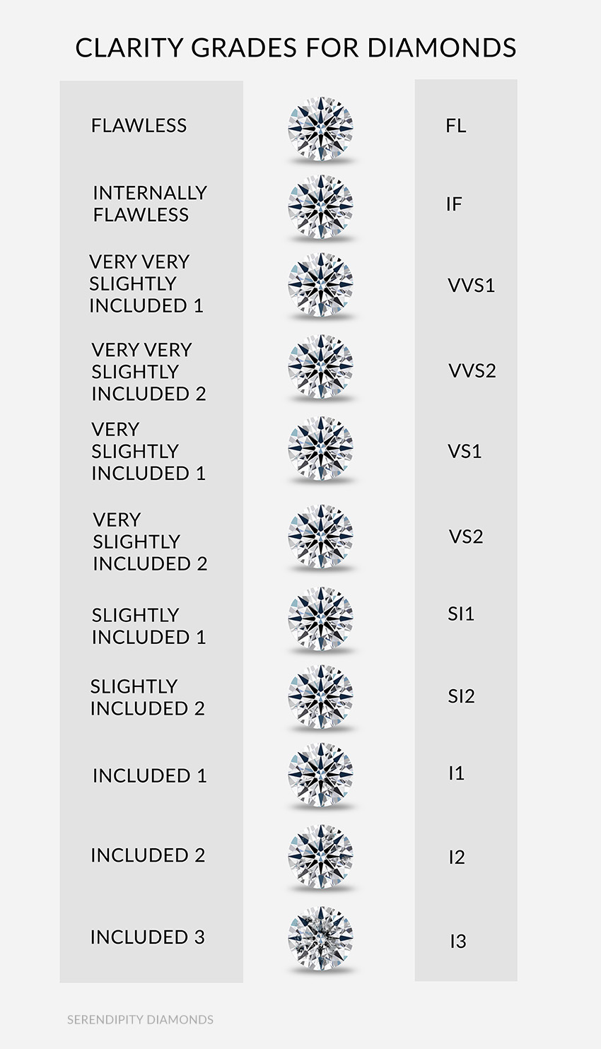 - Included (I1, I2, and I3) Inclusions are obvious under 10x magnification which may affect transparency and brillianceMany inclusions and blemishes are too tiny to be seen by anyone other than a trained diamond grader. To the naked eye, a VS1 and an SI2 diamond may look exactly the same, but these diamonds are quite different in terms of overall quality. This is why expert and accurate assessment of diamond clarity is extremely important. Knowing what diamond clarity truly means helps you understand the factors that contribute to diamond quality and price.
